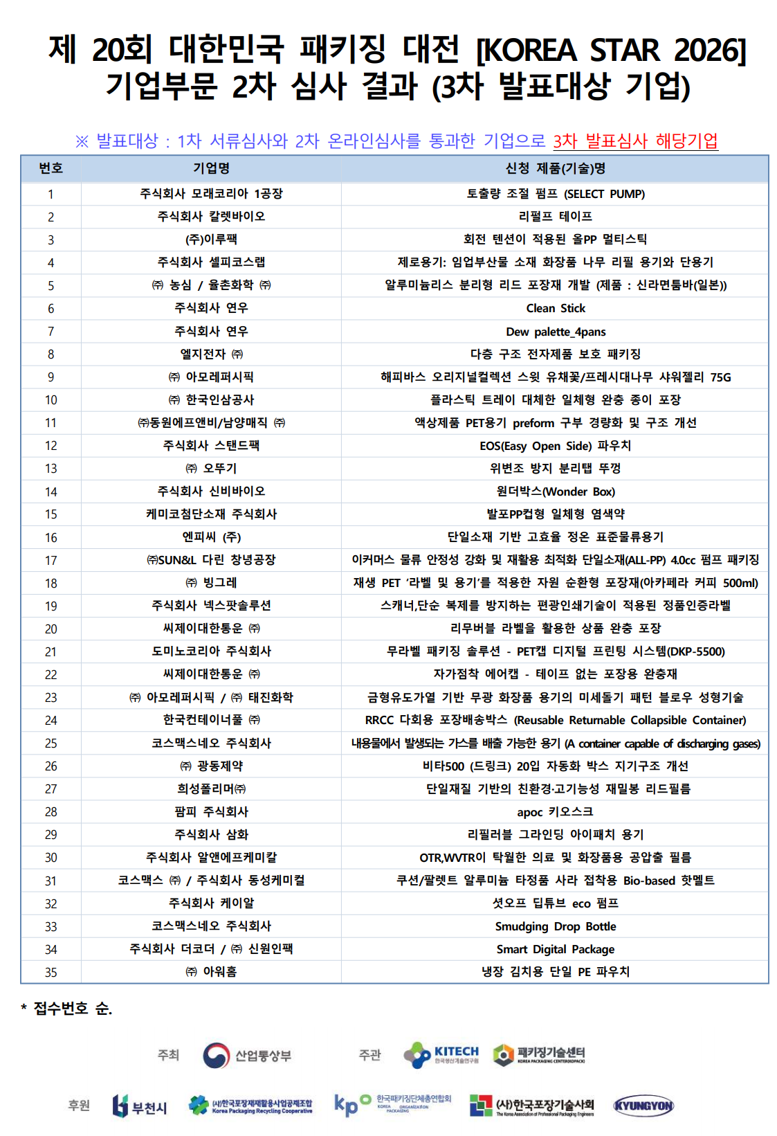 산업통상자원부 공고 제2025-109호 「2026 대한민국 패키징 대전」에 관심을 가지고 참여해 주신 모든 기업 관계자 여러분께 진심으로 감사드립니다.